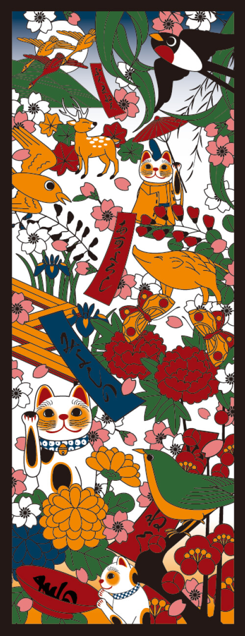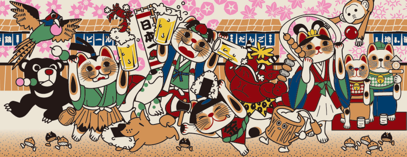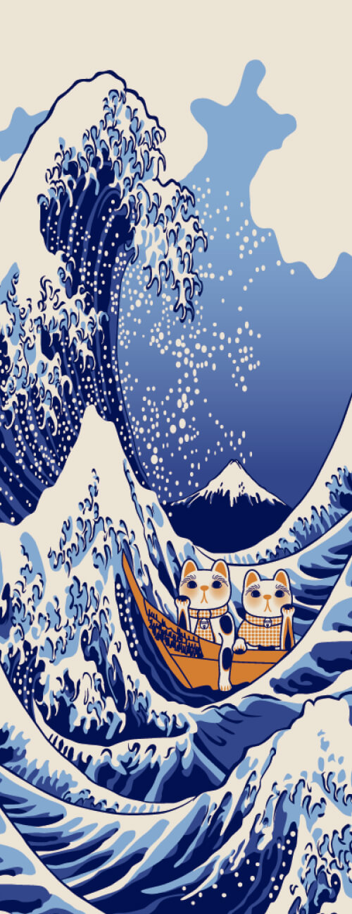 ヤギセイでは、そんな愛らしい招き猫をモチーフに季節のイベントや浮世絵などと絡めて、ポップでコミカルなデザインに仕上げております。招き猫たちの多彩な表情と共に色鮮やかな仕上がりをお楽しみください。